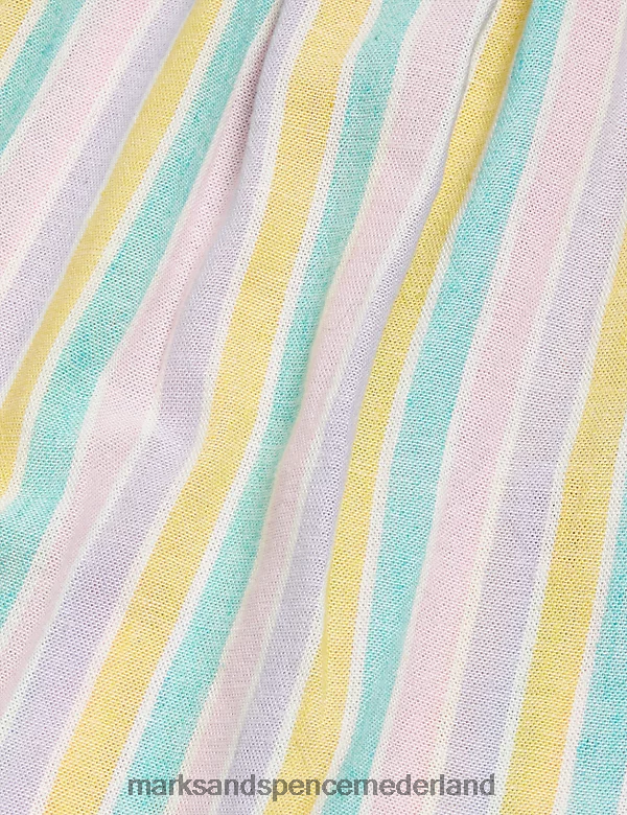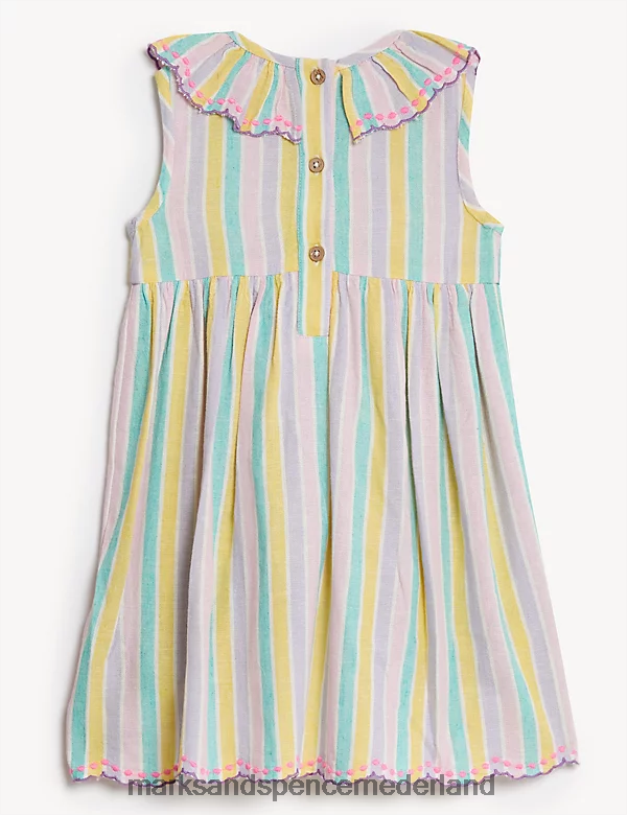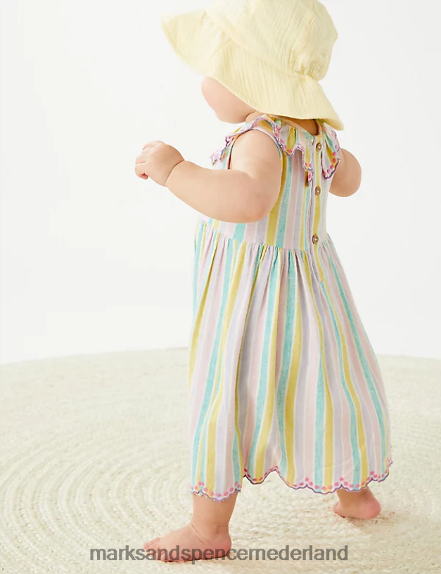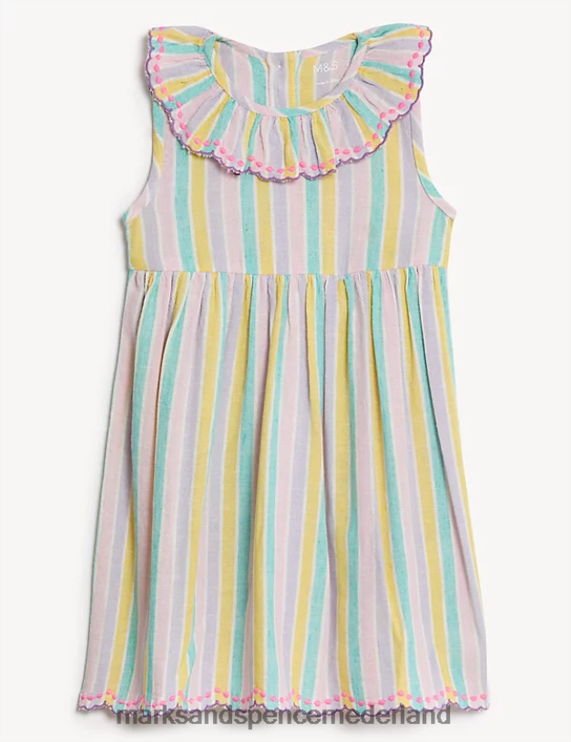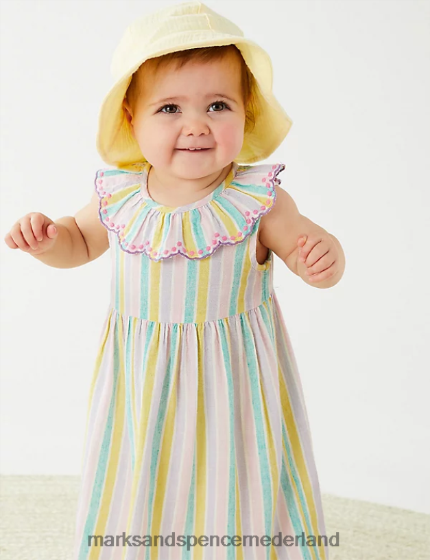 Maak ze klaar voor zonnige dagen met deze gestreepte jurk, voorzien van een vleugje linnen voor ademend vermogen. De plooien in de taille zorgen voor een volle rokvorm die voldoende bewegingsruimte geeft. de geschulpte zoom en kraag zijn voorzien van geborduurde stippen voor een extra mooie touch. compleet met een nette keyhole knoopsluiting aan de achterkant.